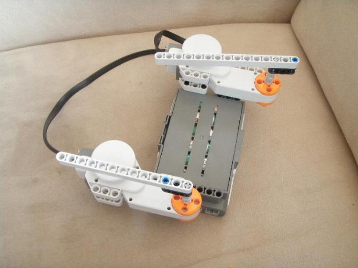 I recently built my own stationary wall-mounted one to record a party we held in our home. As you can see, it doesn't look like much, but it is capable of rotation on the Z axis, and tilt on the Y axis. It is secured to a coat rack with rubber bands, and stabilized with rubber wheels. The camera, (not shown in pictures,) is just a web cam which rests on the top of the robot. Live video from the camera is passed through the usb cord into a computer which stores the data for further use. The program for Surveillance was very simple because I had only an hour to build it. It ran two loops; one controlling the tilt, and the other, the rotation.